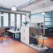 Der offene Empfangsbereich des Büros, lädt zur Kommunikation ein. Zugleich entsteht Raum für geschützte Arbeitsplätze.